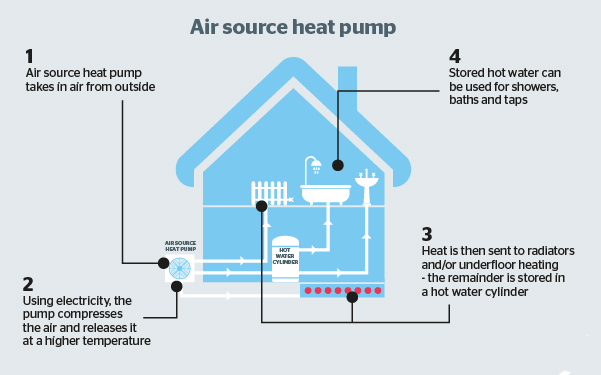 Air source heat pumps (ASHPs) absorb heat from the outside air. This heat can then be used to heat radiators, underfloor heating systems, or warm air convectors and hot water in your home.
